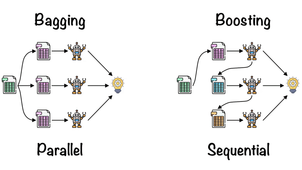 The most popular ensemble techniques are Bagging, or Bootstrap Aggregating, and Boosting. Though these two models have the same aim, their methods to improve model performance vary deeply from each other. Bagging trains several independent models to decrease radiance, while boosting trains models sequentially to decrease bias, in which each model learns from the mistakes of its predecessors.